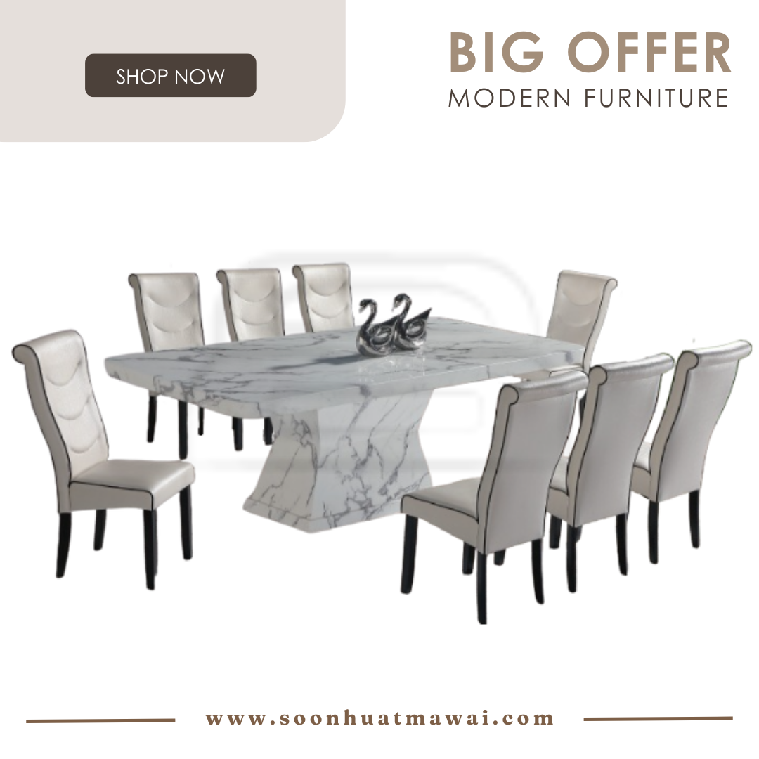 1020 T&L + H2036 DINING SET 1+8 1020 T&L (3748) L100 W200 H75 MARBLE DINING TABLE H2036 (PU) W47 D63 H10 DINING CHAIR DESIGN CHAIR CAN CHOOSE: - H2035 (PU) W47 D63 H10 **DELIVERY NOT INCLUDE