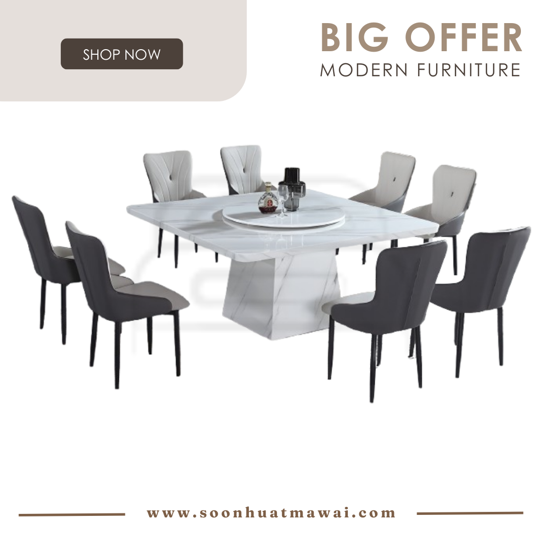5959 T&L (9609)+213 (PU) DINING SET 1+8 T: 5959 T&L (9609) L1500 W1500 H750mm C: 213 (PU) W480 D580 H890mm COLOUR: GREY+DARK GREY