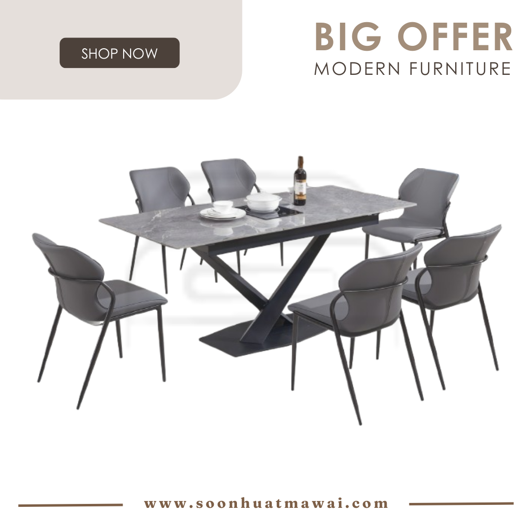 A05+223(PU) DINING SET 1+6 T: A05 L1800 (E400) W800 H750MM C: 223(PU) W465 D600 H820MM COLOUR: GREY