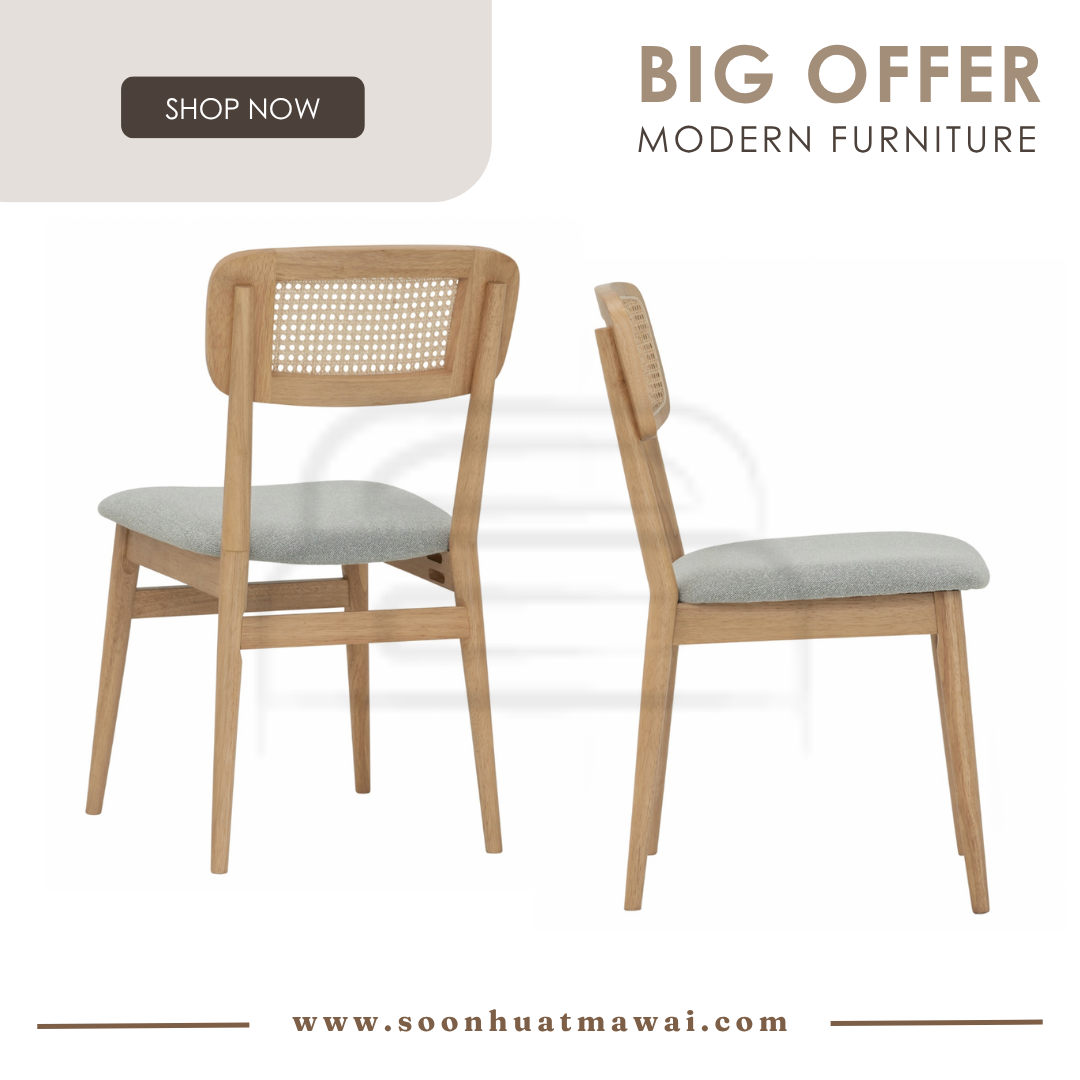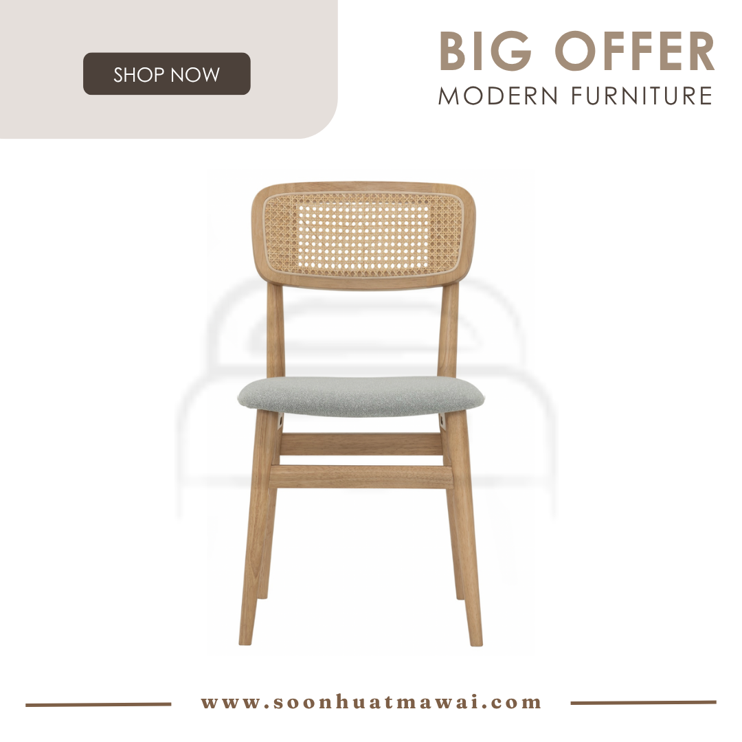 Materials CHAIR LEG:MALAYSIAN OAK CHAIR BACK:RATTAN CHAIR SEAT: LAKE FABRIC Colours 102 NATURAL/6183 MINT GREY Specification Dimension (mm): W470 D565 H850 SH480 Gross Weight (kg): 6.50 m³: 0.0526 Pack Type: 2PCS/CTN Assembly Type: KD (KNOCK DOWN) Carton Dimension (mm) 241624: L885 W245 H485