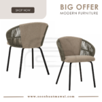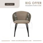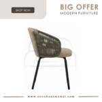 Atlas dining chair in Matt Black Epoxy leg, arm with Green colour Olefin rope, Olive Grey colour Devoir fabric chair seat and back.