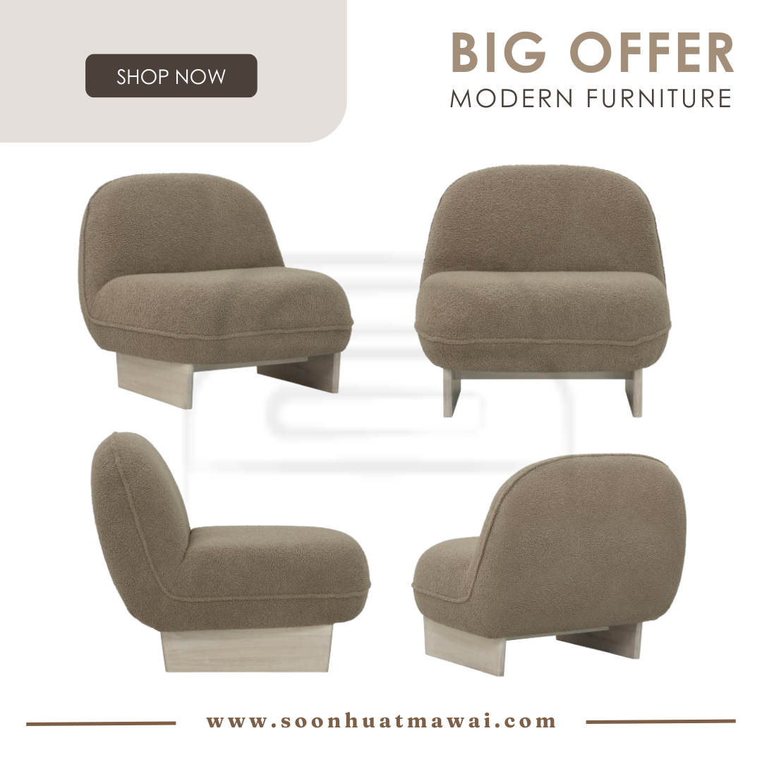 Materials CHAIR LEG: MALAYSIAN OAK CHAIR COVER: TEDDY FABRIC Colours CHAIR LEG: 109 COCOA CHAIR COVER: 3784 CARAMEL Specification Dimension (mm): W850 D910 H750 SH425 Gross Weight (kg): 20.20 m³: 0.5265 Pack Type: 1PC/CTN Assembly Type: SETUP (BUILT UP) Carton Dimension (mm) -------------------------------------