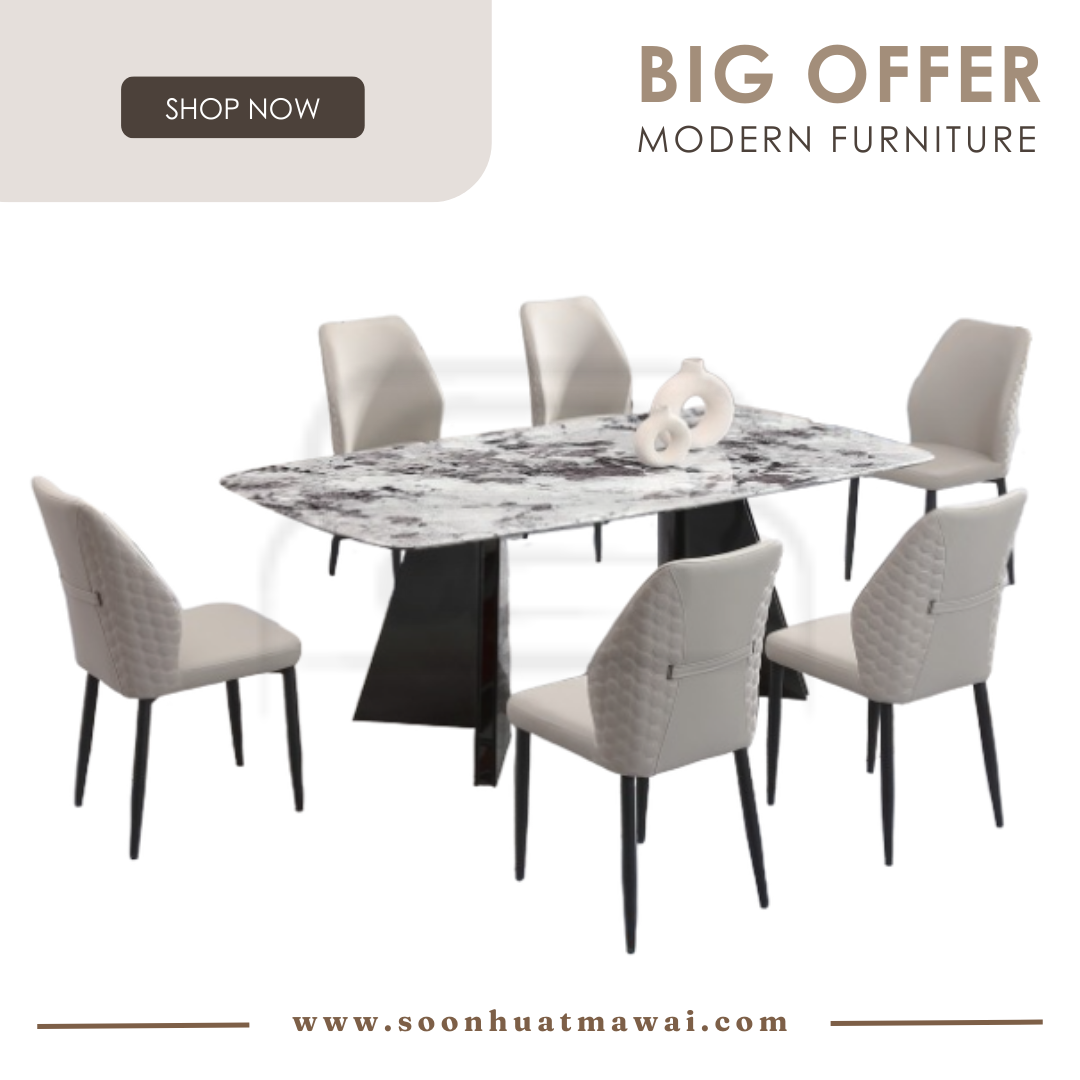 DT270+9016 + 255 ZQ DINING SET 1+6 DT270+9016 (7228) L160 W90 H75 MARBLE DINING TABLE 255 ZQ (PET FRIENDLY PU) W46 D58 H90 DINING CHAIR DESIGN CHAIR CAN CHOOSE: - H3933 (PU) W46 D56 H99Â - H3934 (PU) W46 D56 H99 - H8439 (PET FRIENDLY FABRIC) W45 D61 H99 -LOTAN (FABRIC) W44 D61 H82 - 254 ZQ (PET FRIENDLY PU) W46 D58 H90 - 256 ZQ (PET FRIENDLY PU) W49 D60 H88 - 257 ZQ (PET FRIENDLY PU) W46 D58 H90 **DELIVERY NOT INCLUDE