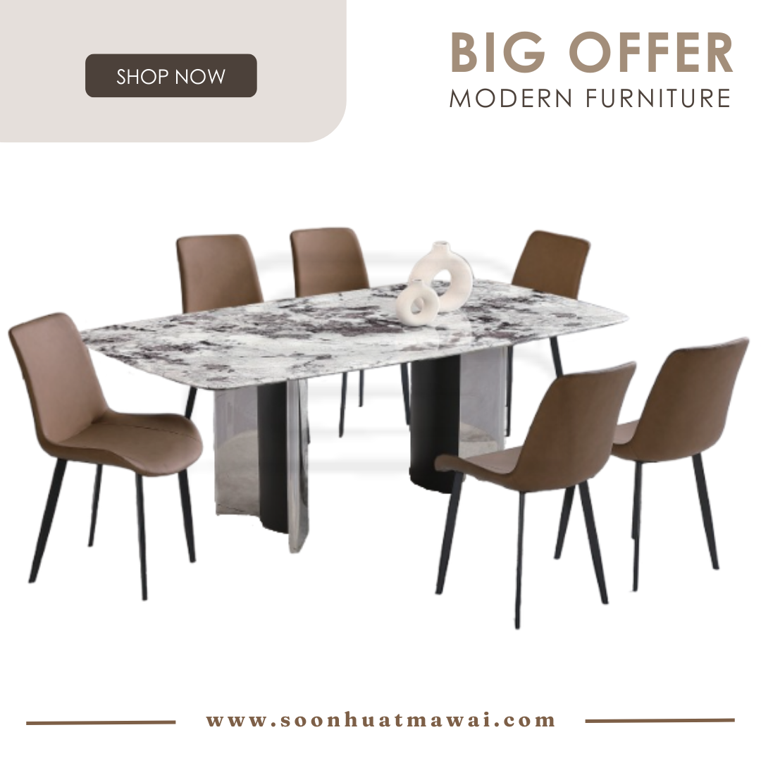 DT713+9016 + 1993 DINING SET 1+6 DT713+9016 (7228) L160 W90 H75 MARBLE DINING TABLE 1993 (PU) W51 D54 H85 DINING CHAIR DESIGN CHAIR CAN CHOOSE: - H8239 (PU) W43 D56 H90 - H8241 (PET FRIENDLY FABRIC) W43 D56 H90 - 1991 (PU) W51 D54 H85 - COSTA-A W440 D48 H80 - COSTA-B W44 D48 H80 - JASWAY STAR-A (FABRIC) W44 D48 H80 - JASWAY STAR-B (FABRIC) W44 D48 H80 **DELIVERY NOT INCLUDE