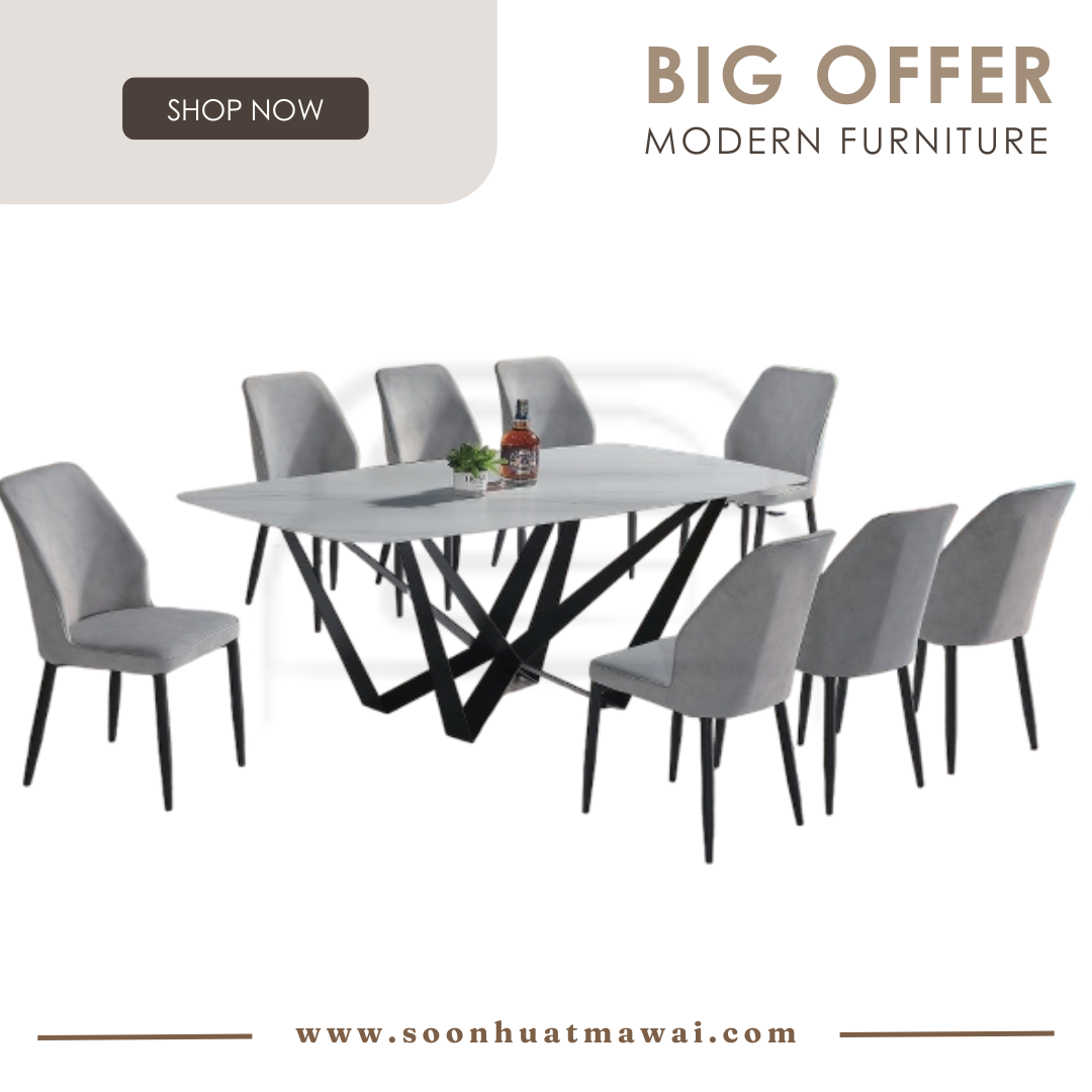 GOLISTIC+CRM9018 + 264 ZQ DINING SET 1+8 GOLISTIC+CRM9018 (9114 MATT) L180 W90 H75 CERAMIC DINING TABLE 264 ZQ (PET FRIENDLY FABRIC) W46 D57 H89 DINING CHAIR DESIGN CHAIR CAN CHOOSE: - 239 ZQ (PET FRIENDLY PU) W44 D56 H90 - 240 ZQ (PET FRIENDLY PU) W44 D56 H90 - 241 ZQ (PET FRIENDLY PU) W44 D56 H90 - 242 ZQ (PET FRIENDLY PU) W44 D56 H90 - 263 ZQ (PET FRIENDLY PU) W46 D57 H89 **DELIVERY NOT INCLUDE