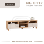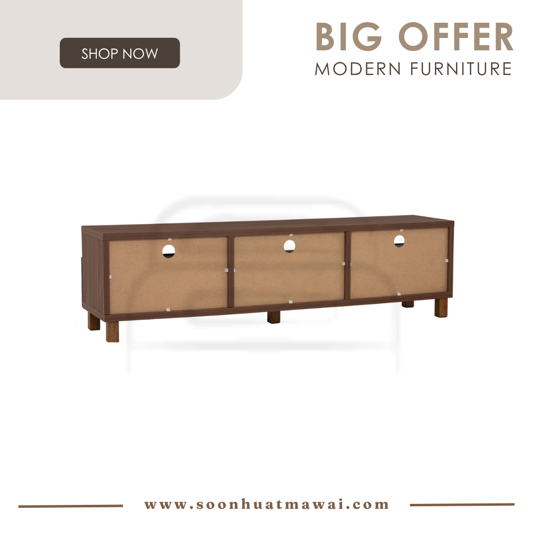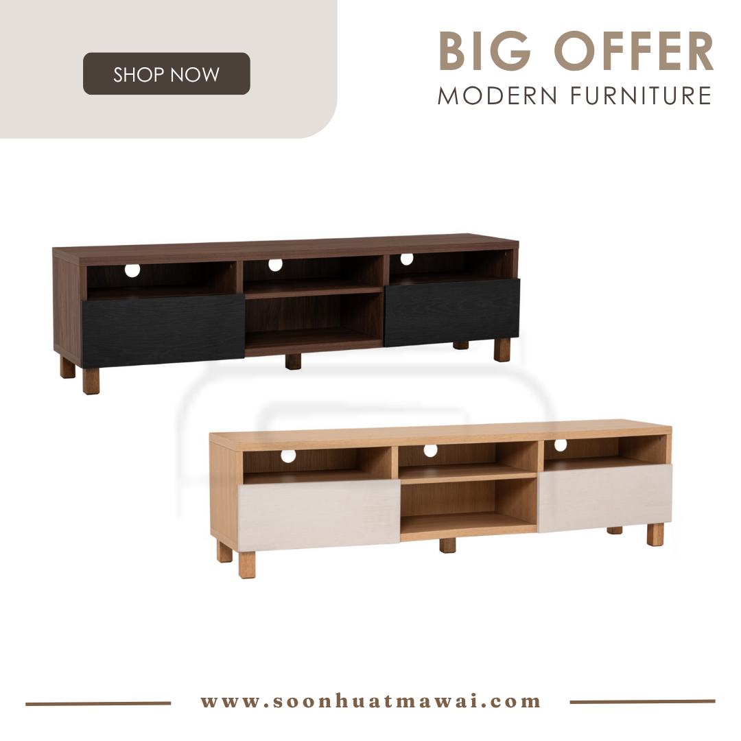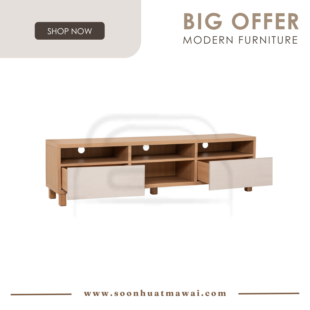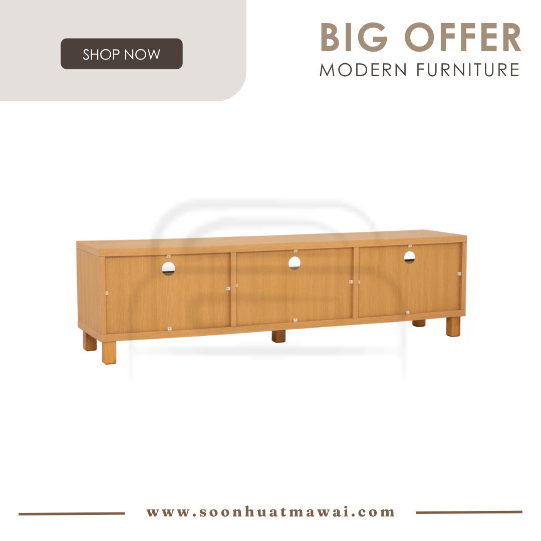 Gordy 1.78M TV cabinet in Oak laminate body with Light Grey laminate door with Natural colour leg