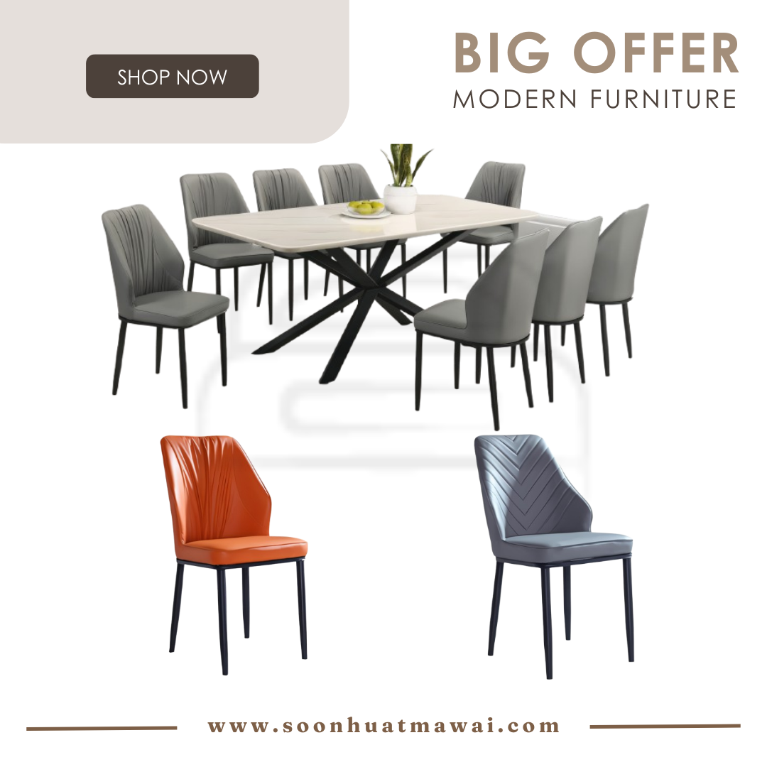 GRAVY+9018 DINING SET 1+8 T: GRAVY + 9018 (166) L1800 W900 H750mm C: 209 (PU) W450 D550 H870mm COLOUR CHAIR CAN CHOOSE: -209 (PU) W450 D550 H870mm -203 (PU) W450 D540 H860mm -206 (PU) W450 D590 H840mm