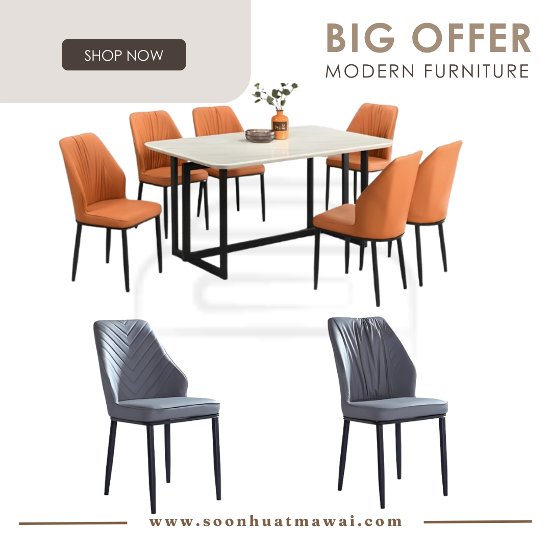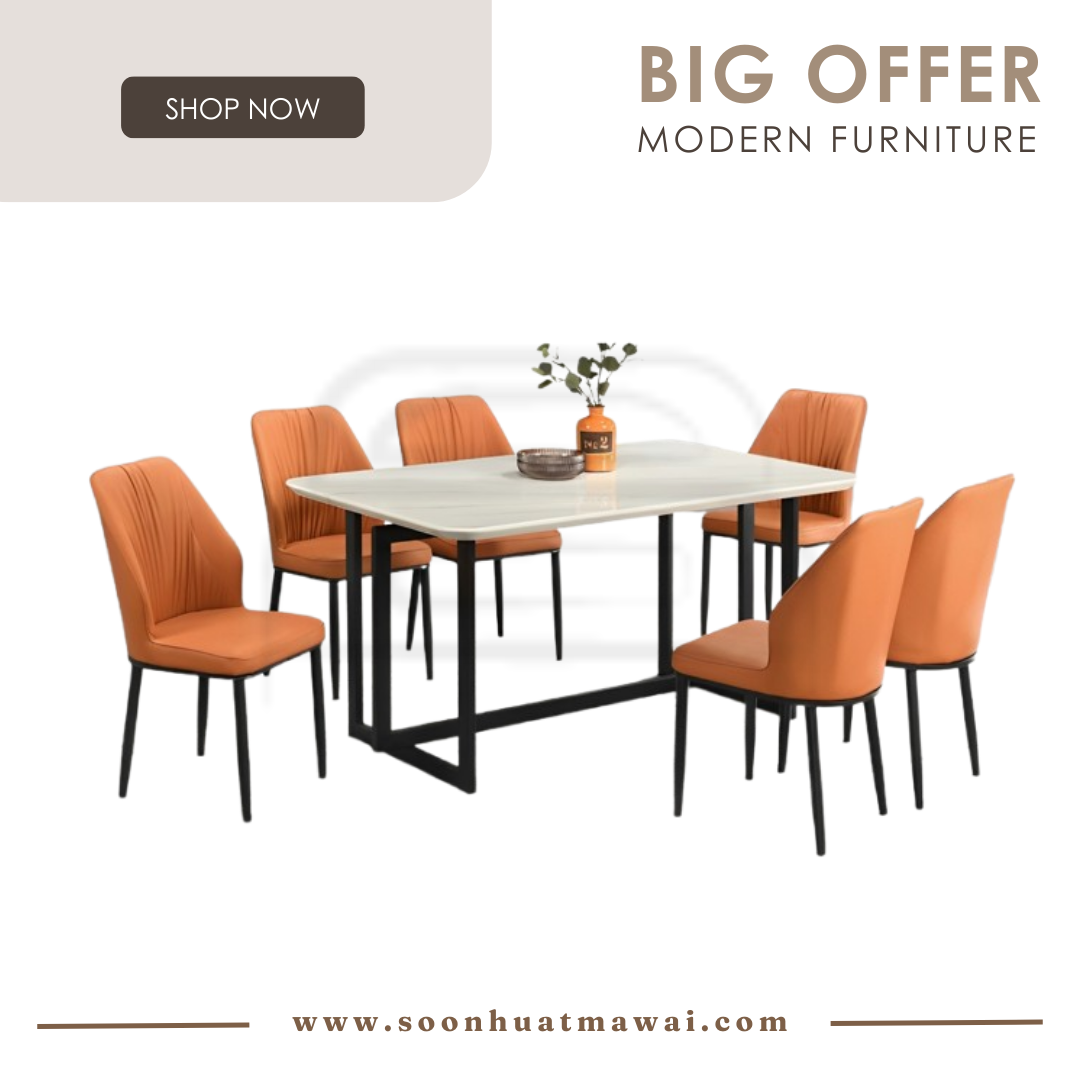 GREENGO+9015 DINING SET 1+6 T: GREENGO + 9015 (166) L1500 W900 H750mm C: 203 (PU) W450 D540 H860mm COLOUR CHAIR CAN CHOOSE: -203 (PU) W450 D540 H860mm -206 (PU) W450 D590 H840mm -209 (PU) W450 D550 H870mm