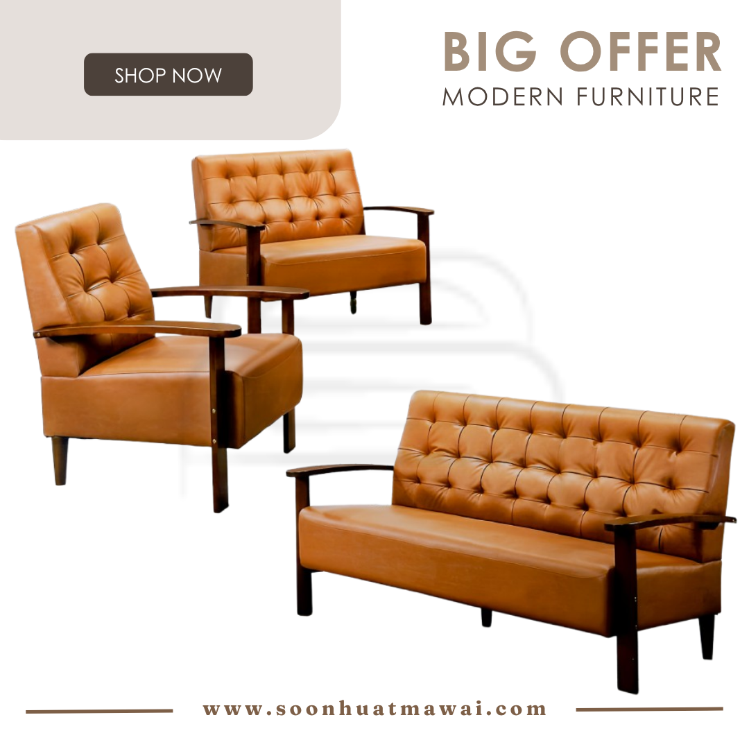 GY SS-8810-2 SOFA SET 1S: H91 W81 L53 2S: H91 W81 L101 3S: H91 W81 L152 SOFA SET 1SEATER + 2SEATER + 3SEATER COLOUR: FABRIC: PVC TAN BROWN WOODEN: DARK BROWN **DELIVERY NOT INCLUDE