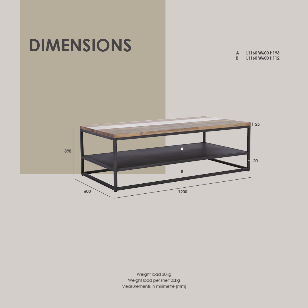 Hachi Coffee Table with Iron colour frame, Woodstock colour shelf