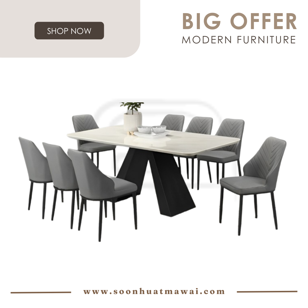 IVANO+9018 DINING SET 1+8 T: IVANO + 9018 (166) L1800 W900 H750mm C: 206 (PU) W450 D590 H840mm COLOUR CHAIR CAN CHOOSE: -206 (PU) W450 D590 H840mm -203 (PU) W450 D540 H860mm -209 (PU) W450 D550 H870mm