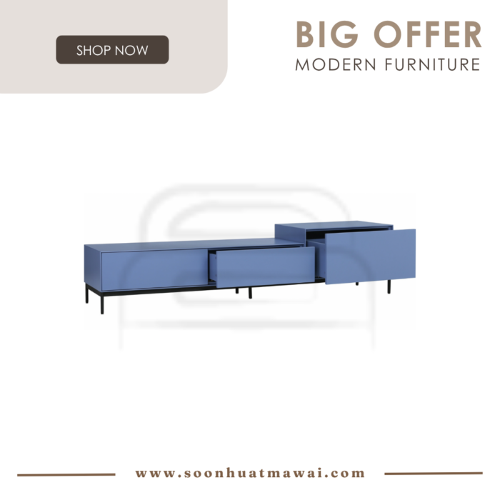 Lowell 1.8M TV Cabinet in Baby Blue colour body with Matt Black Epoxy leg