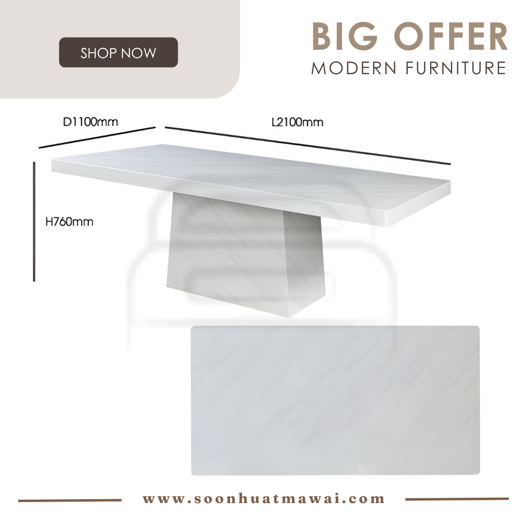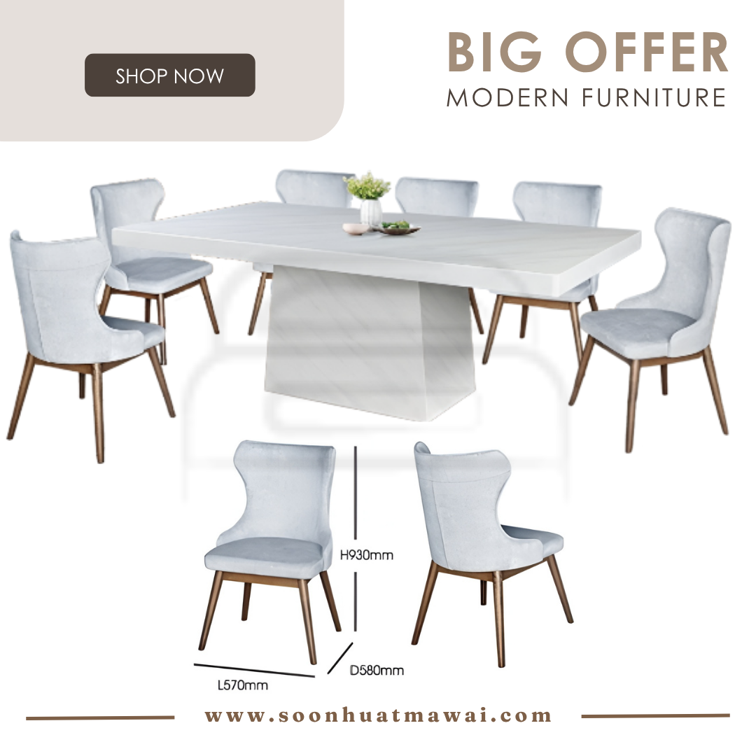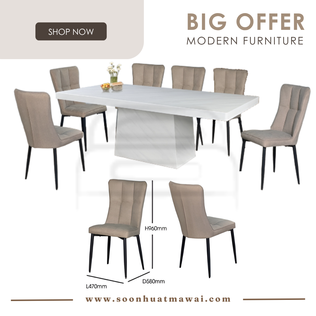 M2147 + C291 / J-C8-8 / MJ154 DINING SET 1+8 M2147 L210 D110 H76 MARBLE DINING TABLE C291 (PU) L60 D55 H80 DESIGN CHAIR CAN CHOOSE: - J-C8-8 (BROWN)(FABRIC) L47 D58 H96 - MJ154 (RKE 001 MISTY)(GREY) L57 D58 H93 **DELIVERY NOT INCLUDE