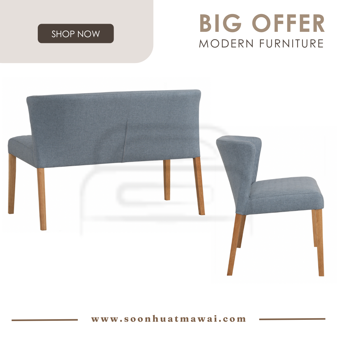 Rhoda 1.1m bench chair with Natural colour leg, Light Blue colour Double fabric seat & back