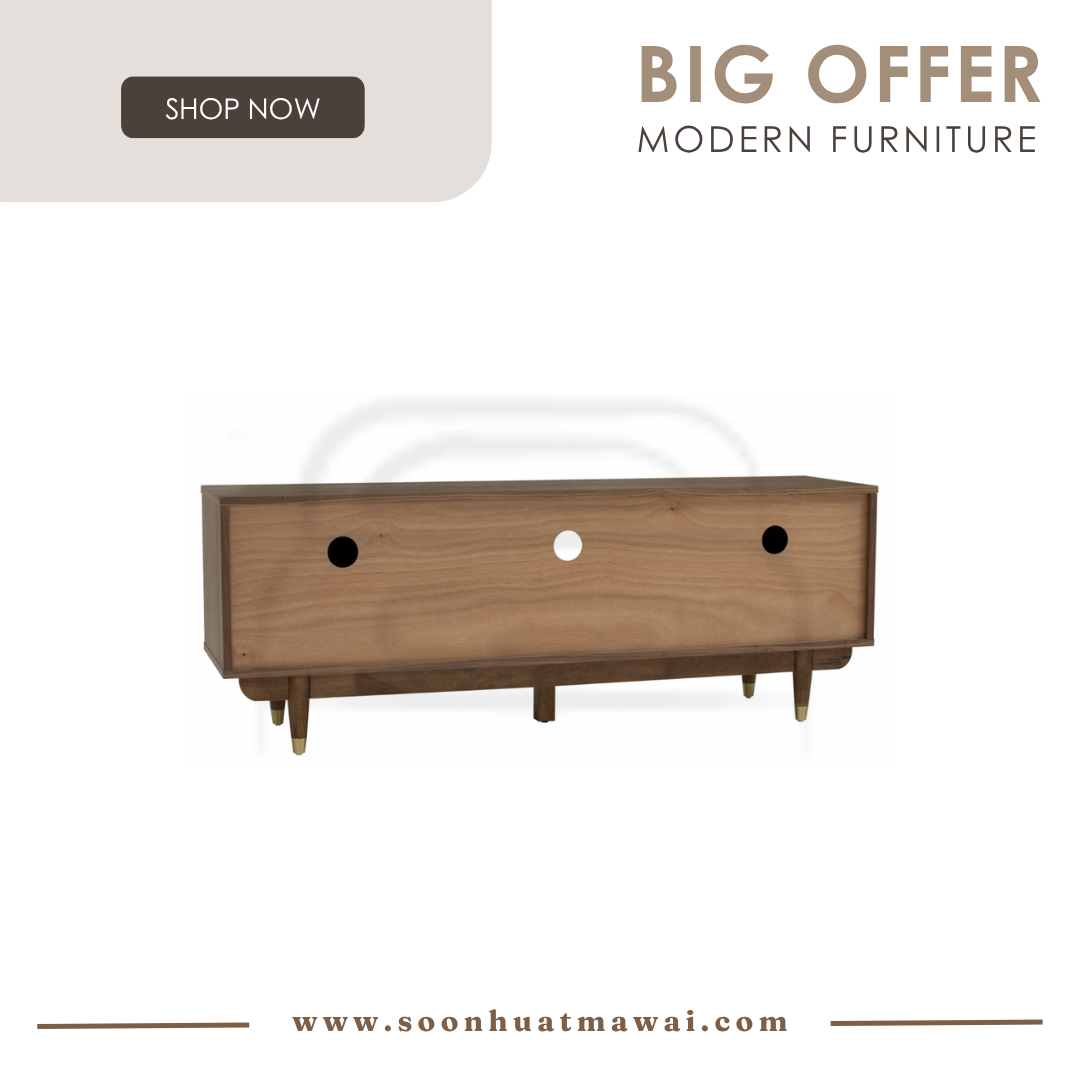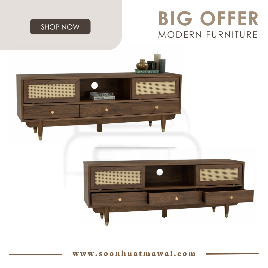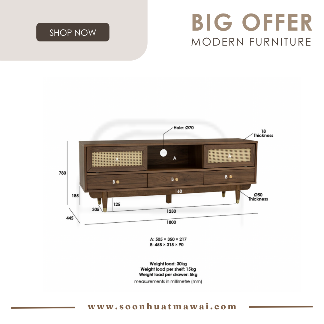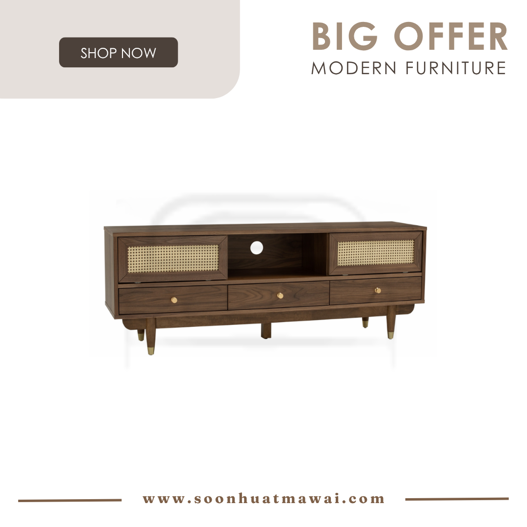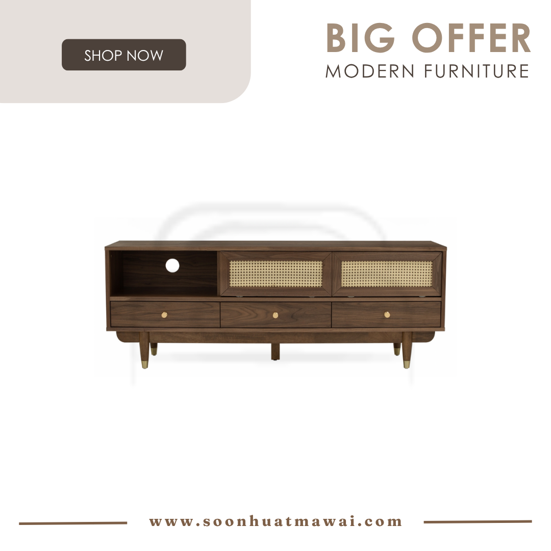 Royston 1.6M TV Cabinet in Walnut veneer body, Natural color synthetic rattan door and with Gold colour leg