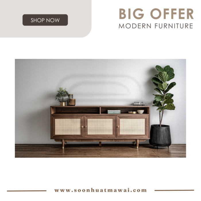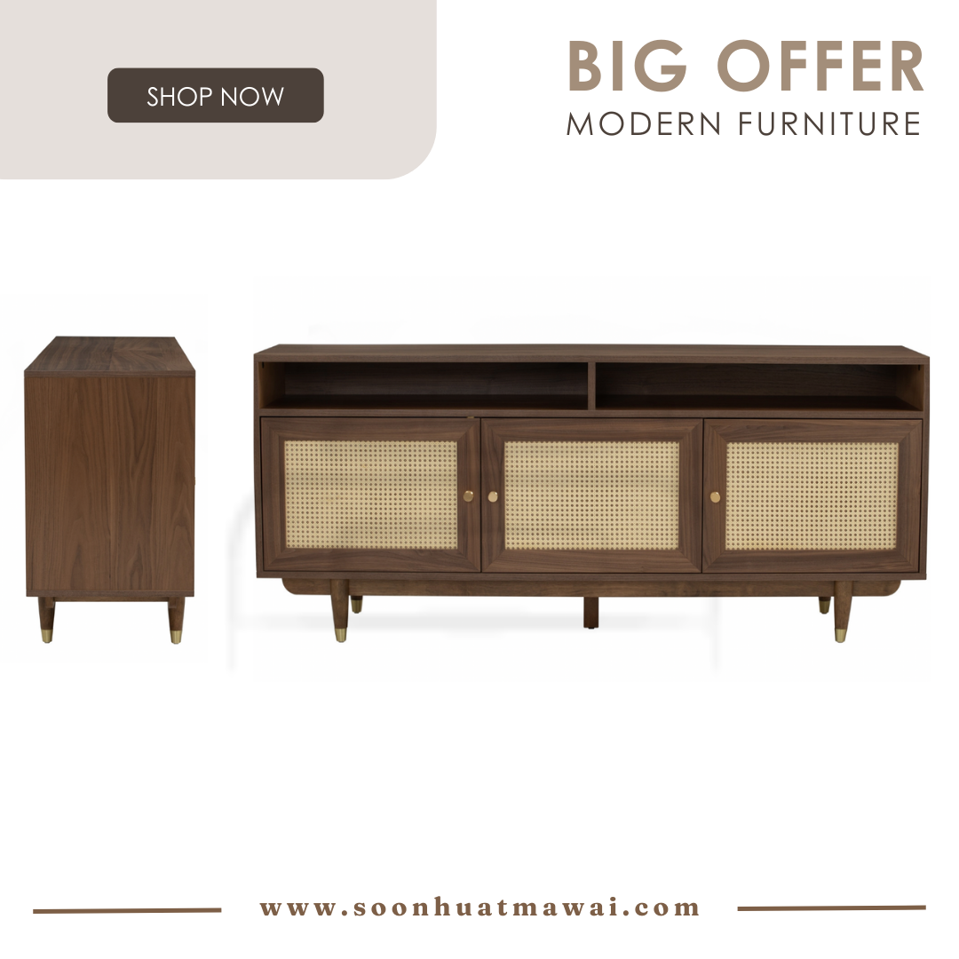 Royston 1.8M Sideboard Cabinet in Walnut veneer body, Natural colour synthetic rattan door and with Gold colour leg