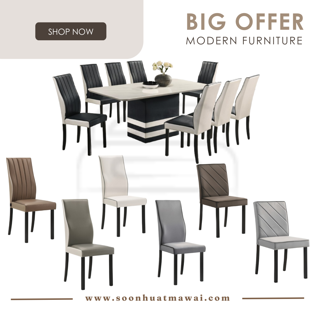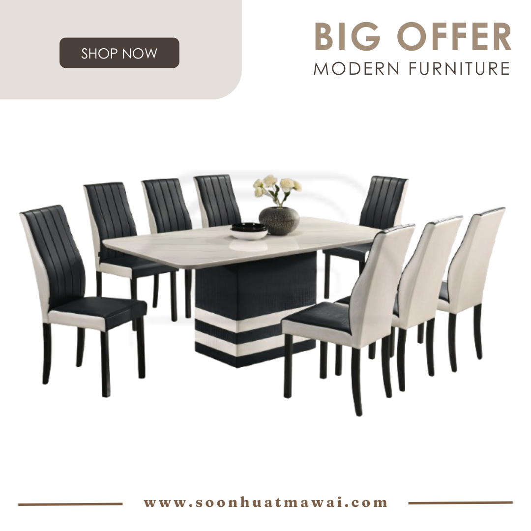 TL7027P+9018 DINING SET 1+8 T: TL7027P + 9018 (166) L1800 W900 H750mm C: H6033 (PU) W450 D575 H1000mm COLOUR CHAIR CAN CHOOSE: -H6033 (PU) W450 D575 H1000mm -H6034 (PU) W450 D575 H1000mm -H6035 (PU) W450 D575 H1000mm -H6036 (PU) W450 D575 H1000mm -H6037 (FABRIC) W450 D575 H1000mm -S827 (FABRIC) W460 D555 H860mm -S828 (FABRIC) W460 D555 H860mm