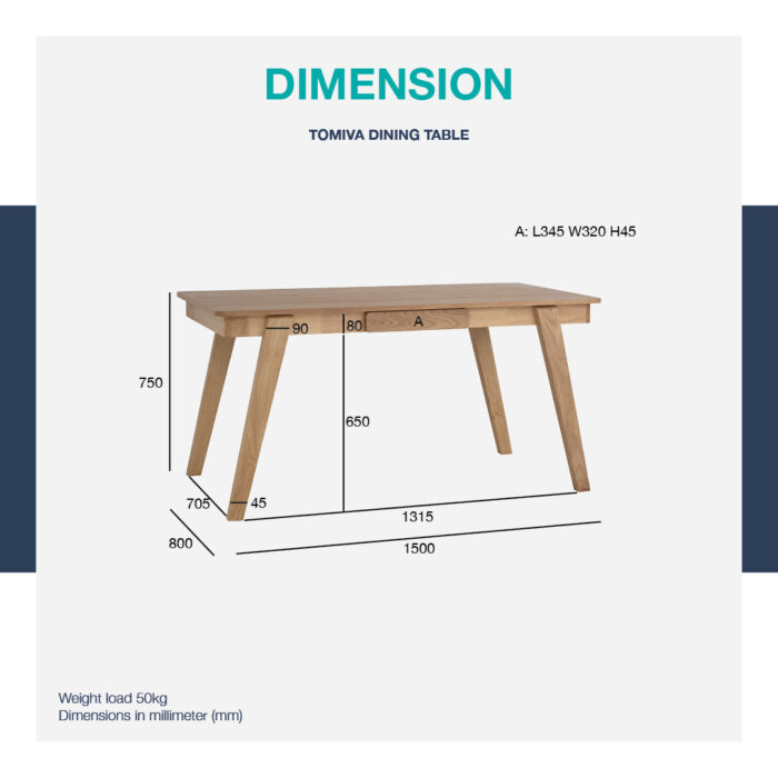 Tomiva 800×1500 Dining Table in Natural colour leg, Oak veneer top