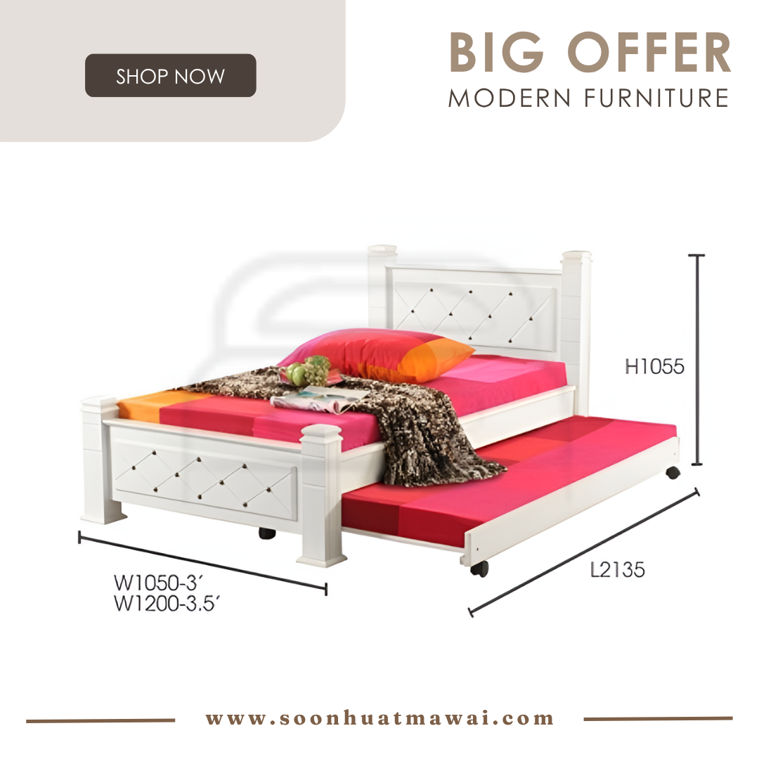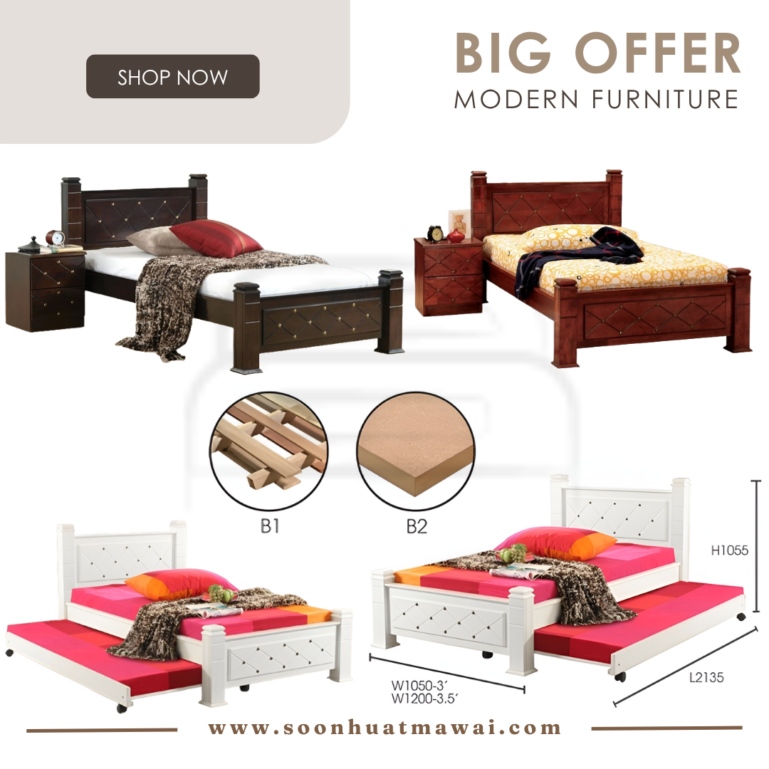 XL 6307 SINGLE BED 3' SINGLE BED SIZE: H1055 L2135 W1050 BED BASE: -B1 -B2 COLOUR: -WHITE -DIRTY OAK -WENGE --------------------------------- XL 6407 SUPER SINGLE 3.5' BED SUPER SINGLE BED SIZE: H1055 L2135 W1200 BED BASE: -B1 -B2 COLOUR: -WHITE -DIRTY OAK -WENGE
