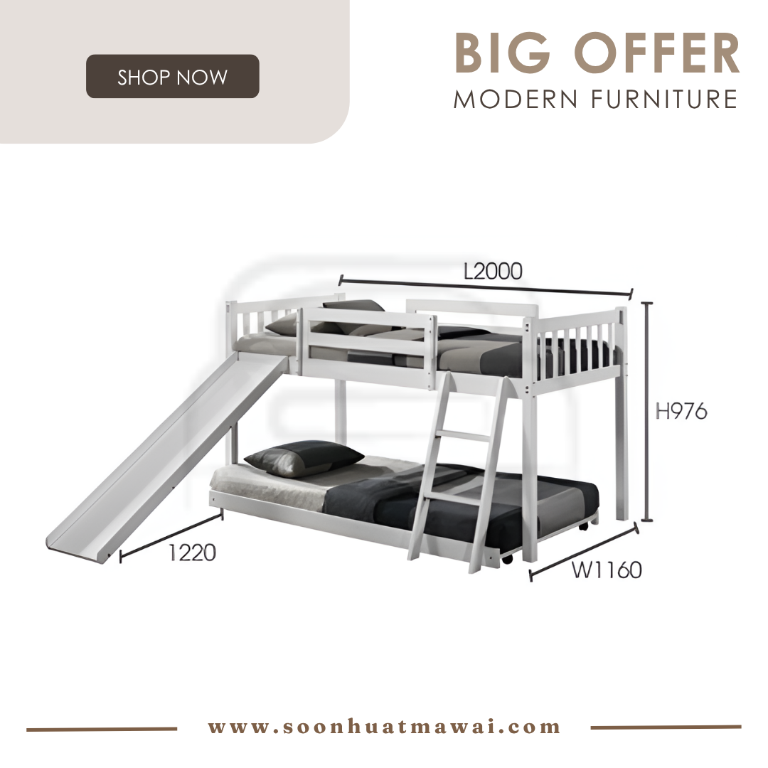 XLV 9399 BED SINGLE WITH PLAYGROUND SIZE: H976 L2000 W1160+1220 DAYBASE: B1 & B2 COLOUR:WHITE -------------------------- XLV 200 BED SINGLE PULLOUT SIZE: H976 L2000 W1160 DAYBASE: B1 & B2 COLOUR:WHITE